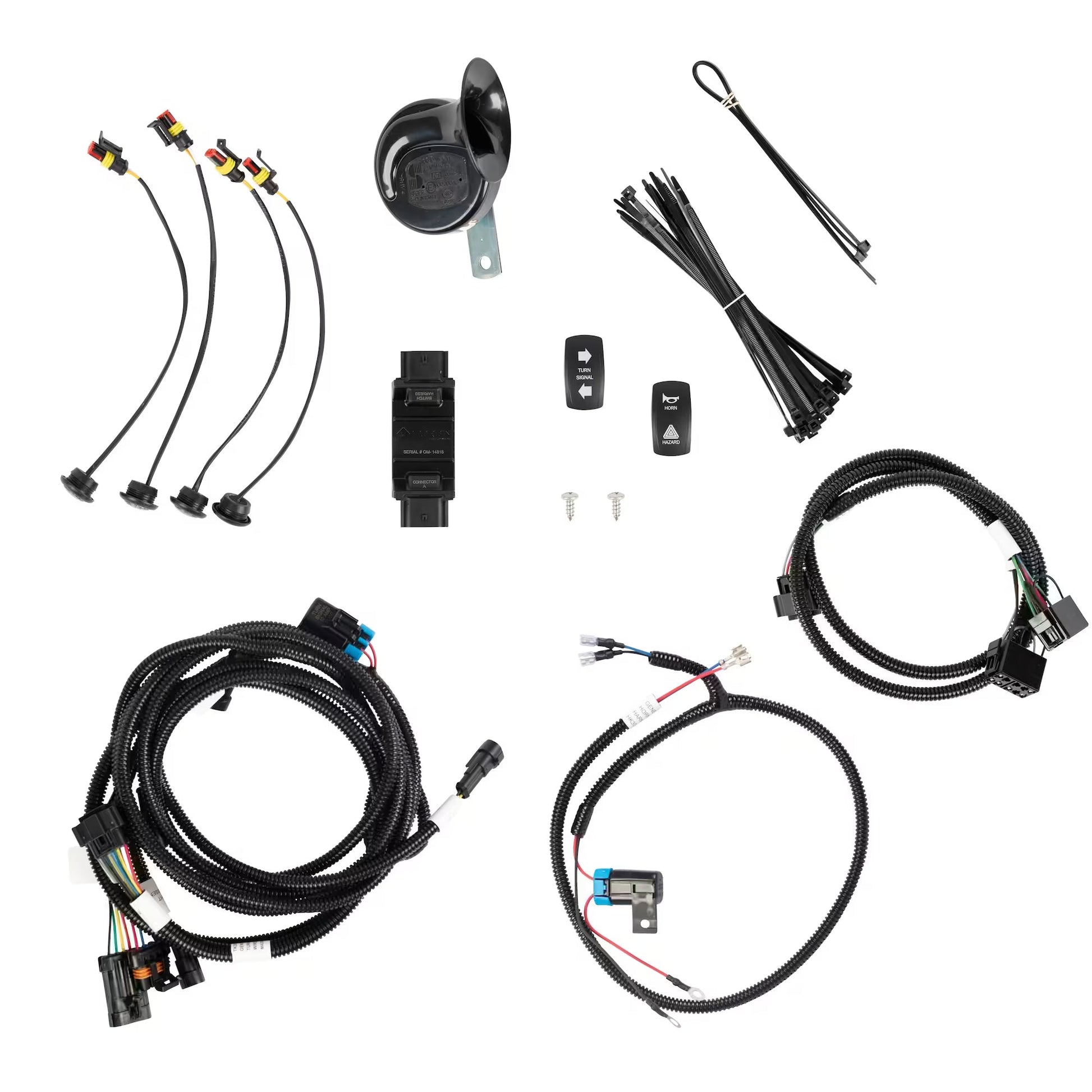 This bundle provides the core electronics for advanced visibility and communication: Turn Signals, Hazards, and an Automotive-Grade Horn.